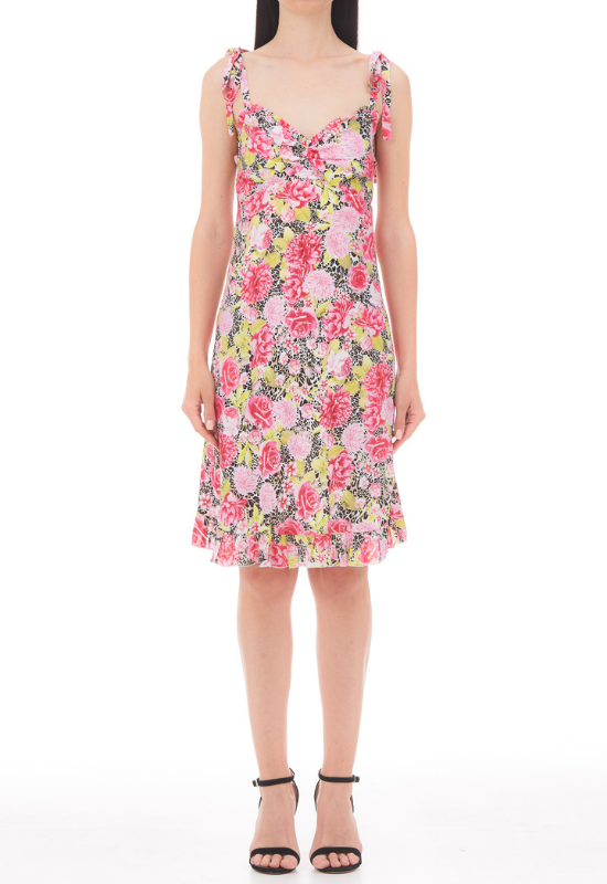 Abito corto con spalline allacciate sulle spalle. Bellissima fantasia floreale tessuto 100% viscosa morbido e fresco.