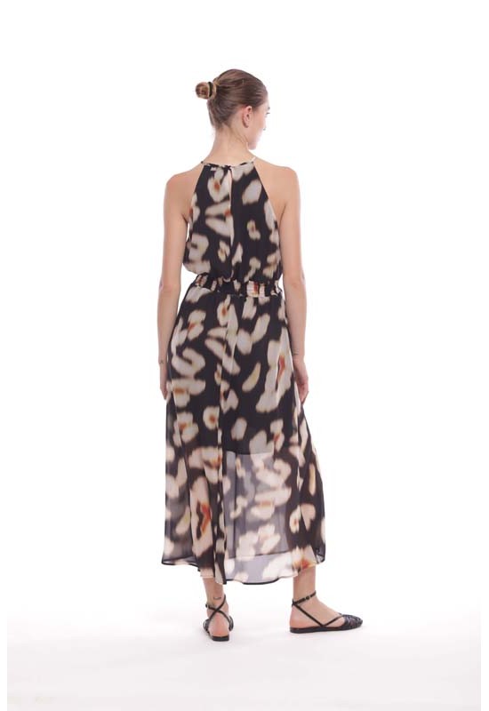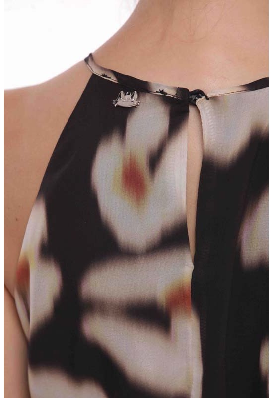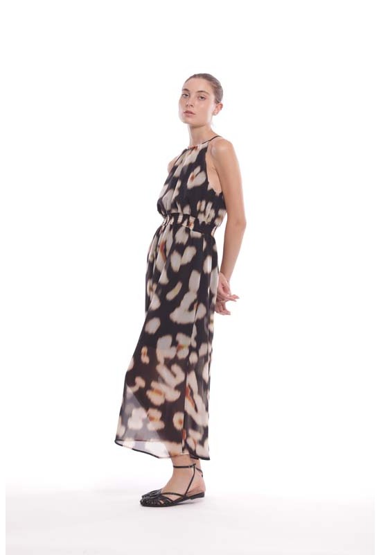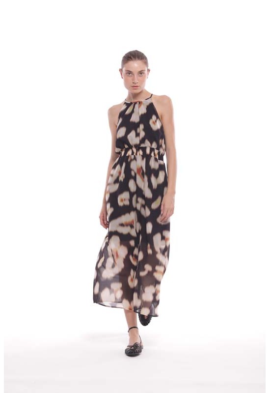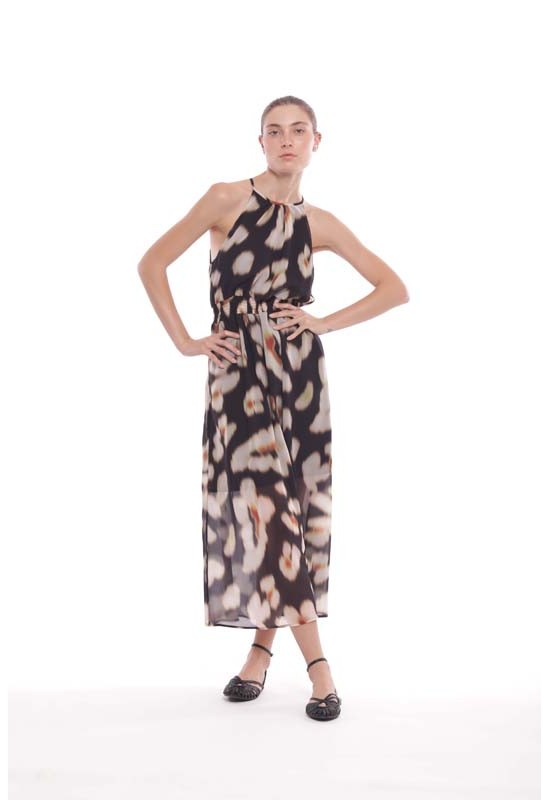 Abito lungo fantasia scura fiore sfumato con trasparenze. Scollo all americana con spalline sottili. Leggermente avvitato. COMP: 100% PL