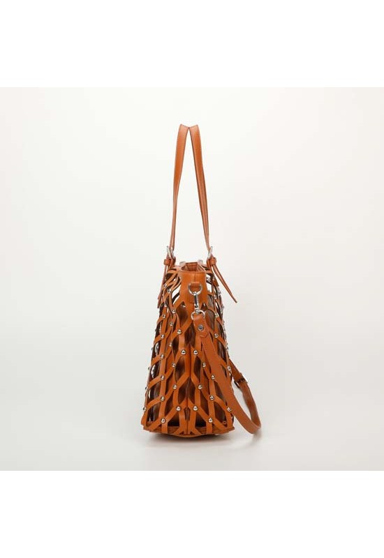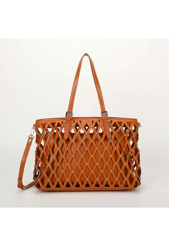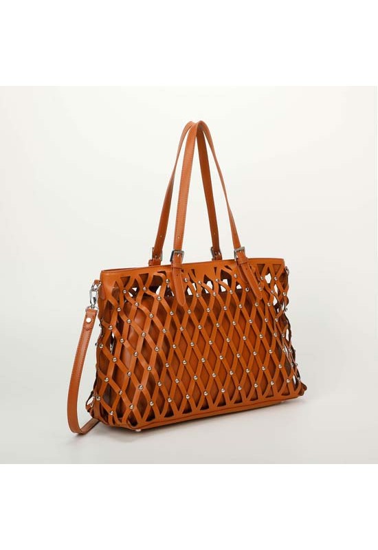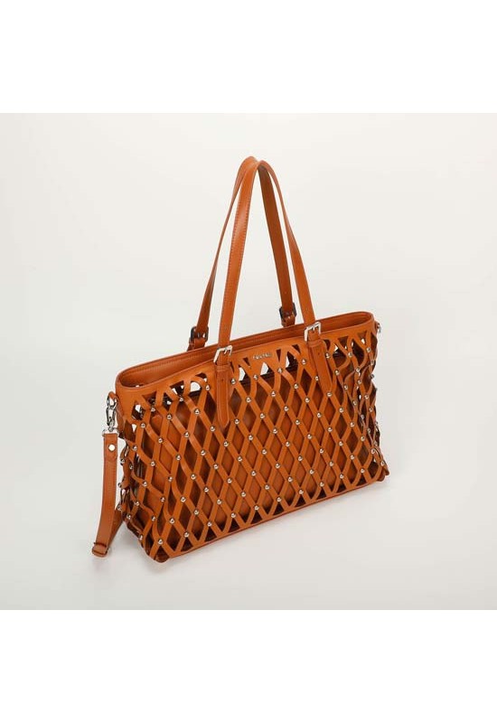 Borsa modello shopping effetto rete con borchie. 2 pratici manici e tracolla. All interno contiene una sacca staccabile. LUNGH: 43cm PROF: 16cm ALT: 31cm COMP: 100% PU - POLIURETANO