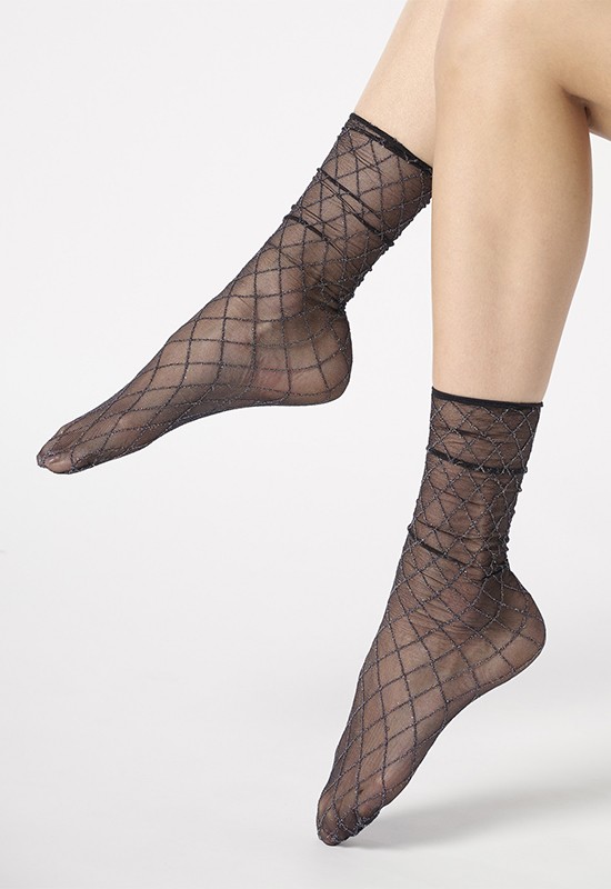 Calzino leggero e versatile con motivo rete con effetto argento. Realizzato con filato sottile e confortevole puessere indossato anche per un look moderno e originale. Polsino a taglio vivo che dona una finitura pulita e discreta perfetta per ogni stile. comp: 82% poliammide 9% fibra metallizzata 9% elastan