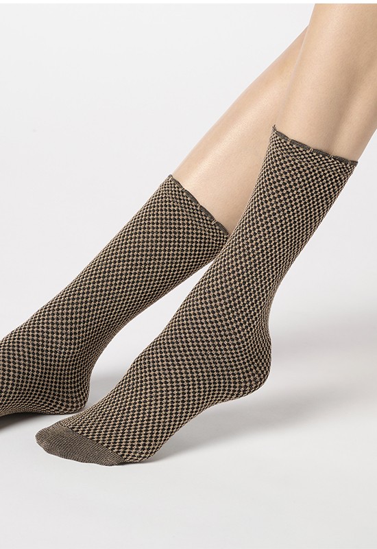 Calzino elegante in viscosa e lamcon raffinato micro motivo geometrico. Polsino con graziosa finitura che dona un tocco sofisticato. Filato leggero e lucente che assicura comfort e stile. comp: 44% poliammide 27% poliestere 14% viscosa 8% fibra metallizzata 7% elastan