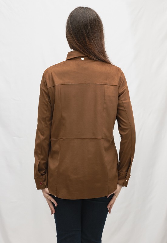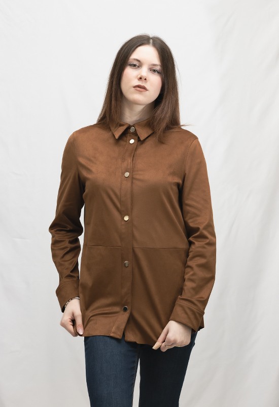 Giacca camicia in simil camoscio sfoderata con collo a camicia maniche lunghe con polsino abbottonatura a clips sul davanti e sui polsi. Composizione: 92% poliestere 8% elastan