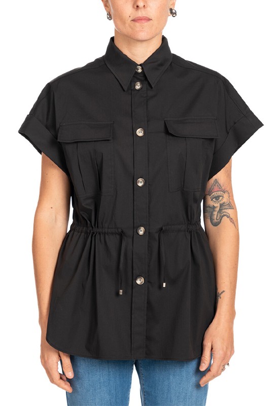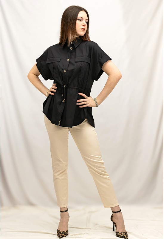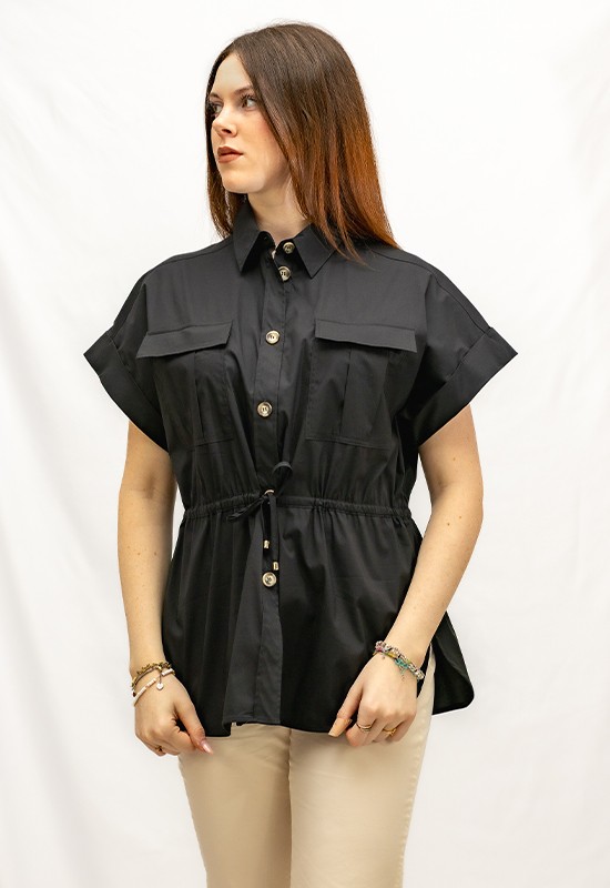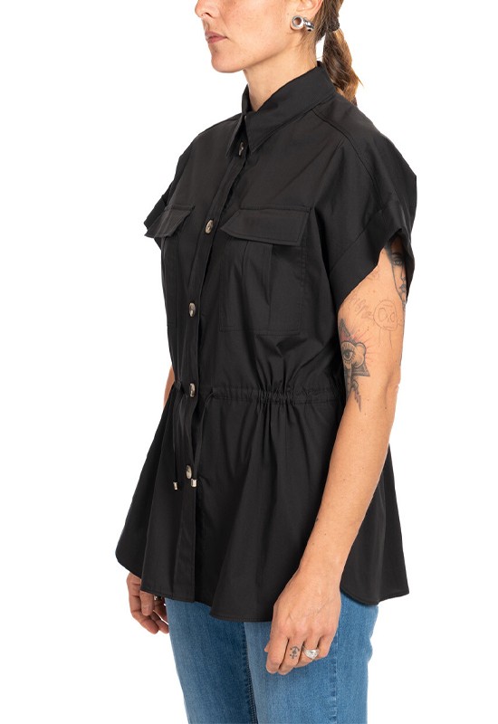 Camicia sahariana mezze maniche in cotone Abbottonata sul davanti con colletto e tasche Coulisse che permette di avvitare la camicia.Vestibilita' morbida Composizione: 65% cotone 29% poliammide 6% Elastan