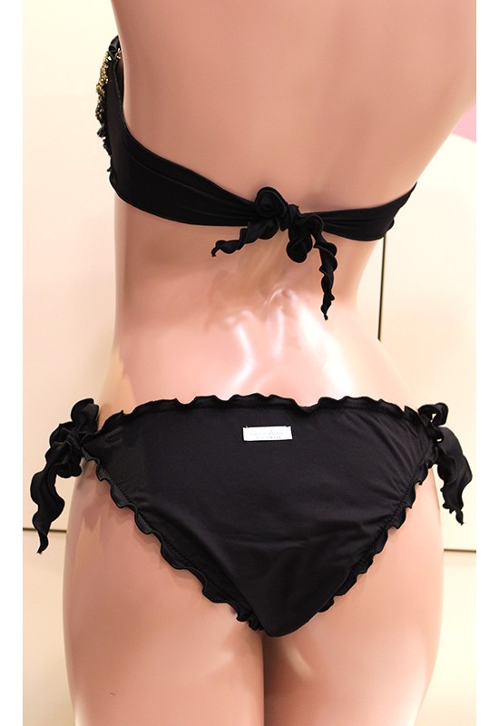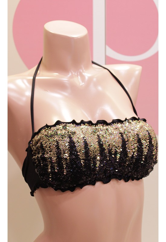 Costume a fascia in paillettes con imbottitura estraibile allacciata sul dietro gli slip con rouches sono annodati sui fianchi .