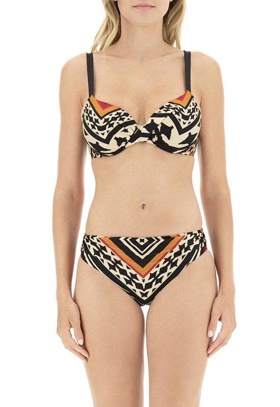 Costume con ferretto drappeggio sul centro del reggiseno. Spalline regolabili gancio sul dietro. Slip con drappeggio sul davanti alto 5 cm . Foderato. Lycra leggera ma sostenuta.