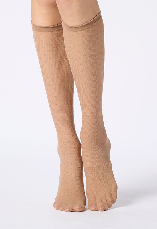 Gambaletto velato effetto tulle con motivo a micro pois. Altezza sotto ginocchio. Comodo bordino. Pesantezza 30 den. Taglia unica comp: 95% poliammide 5% elastan