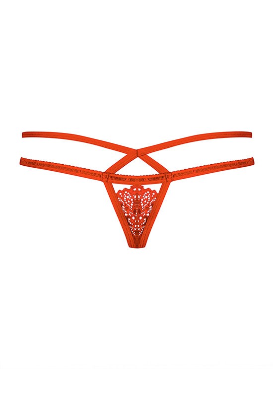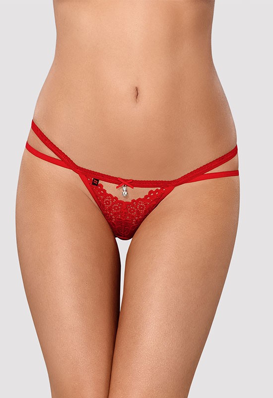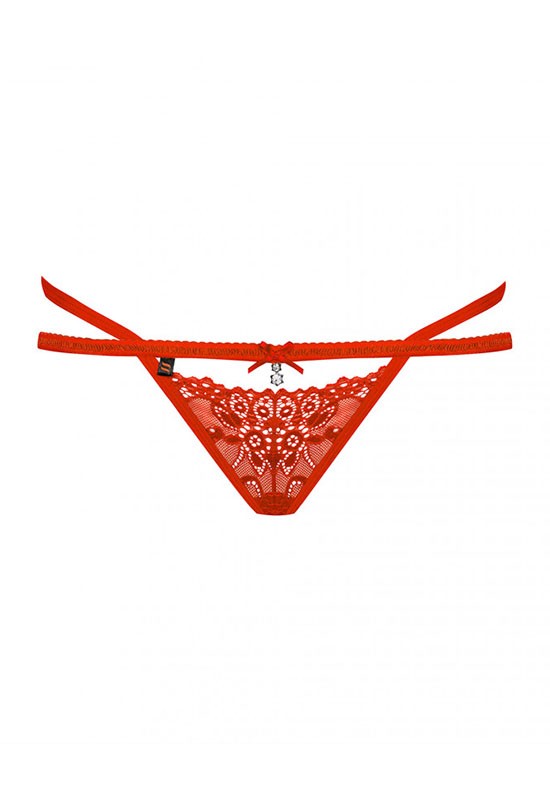 Perizoma rosso di pizzo con cinghie elasticizzate ornato da fiocco e gioielli luccicanti tessuti piacevoli ed elastici (90% nylon 10% elastan)