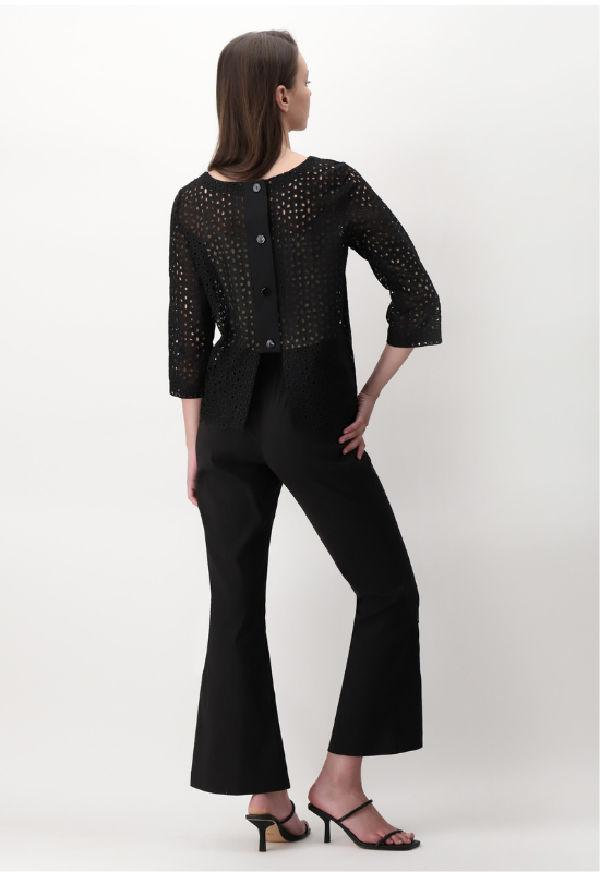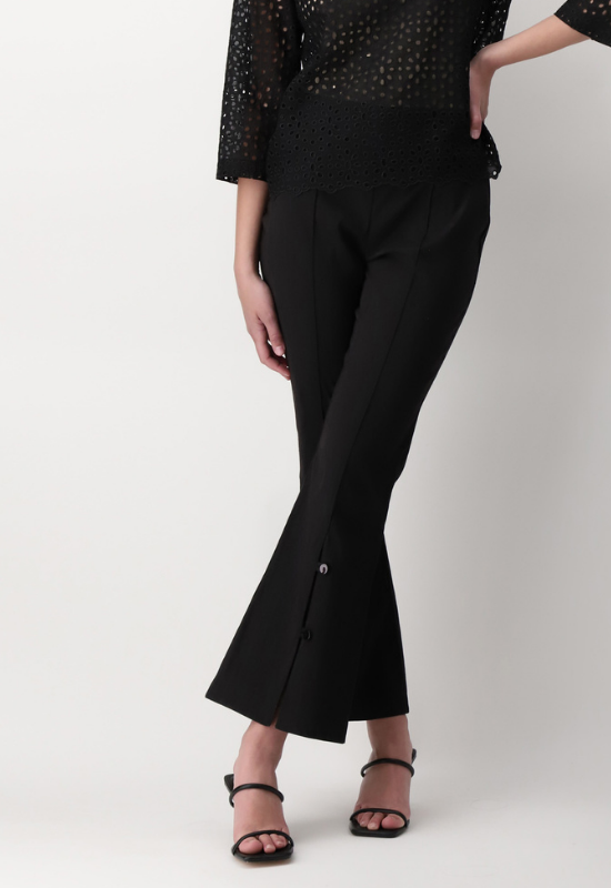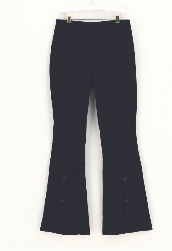 Morbidi leggings a campana comodissimi si indossano in un'attimo grazie al tessuto elasticizzato leggero con trama effetto seta. Spacco frontale abbotonato Composizione :60% Poliestere 36% poliammide 4% elastam