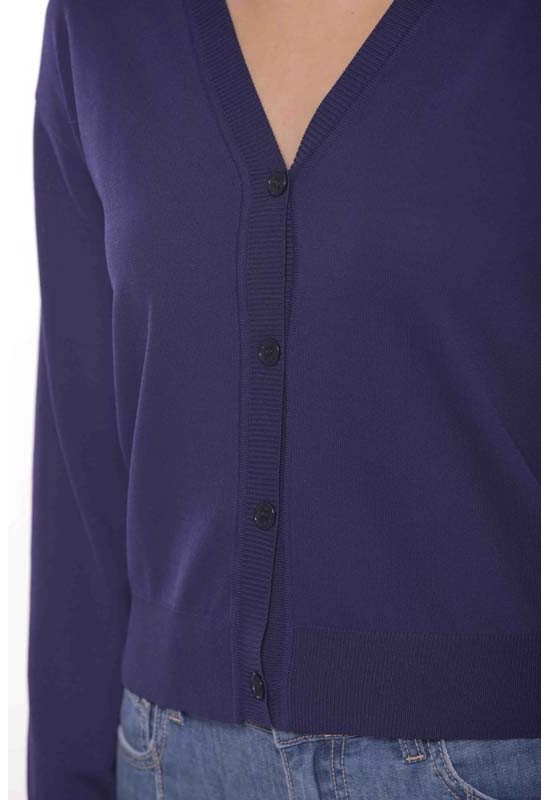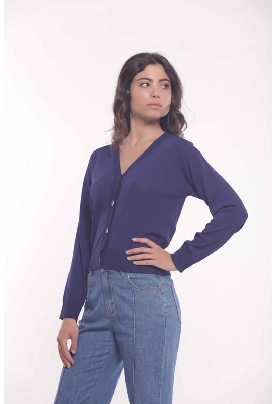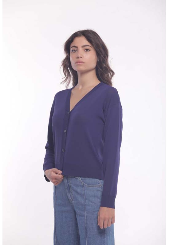 Cardigan basic scollatura a V in viscosa leggera . 4 bottoni sul davanti e polsini sul fondo della manica e sul fondo del cardigan. COMP: 65%VI 35%NY
