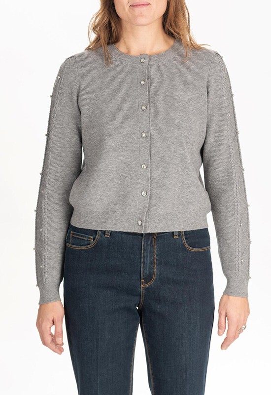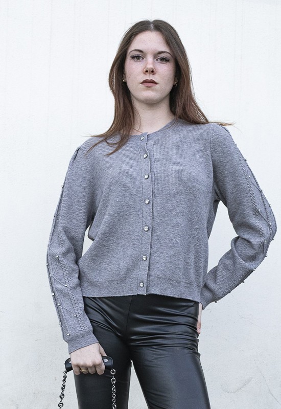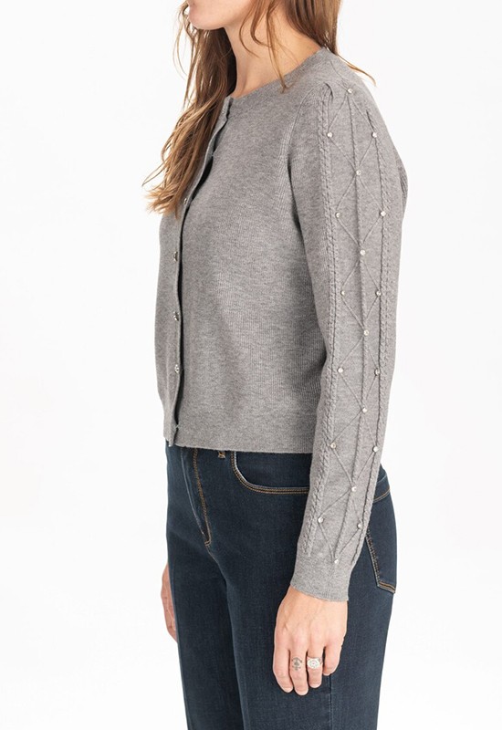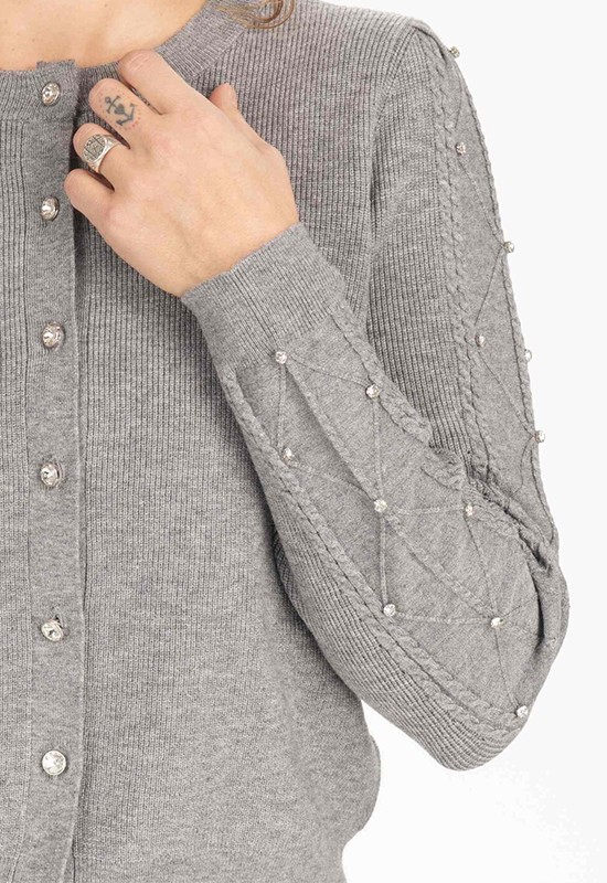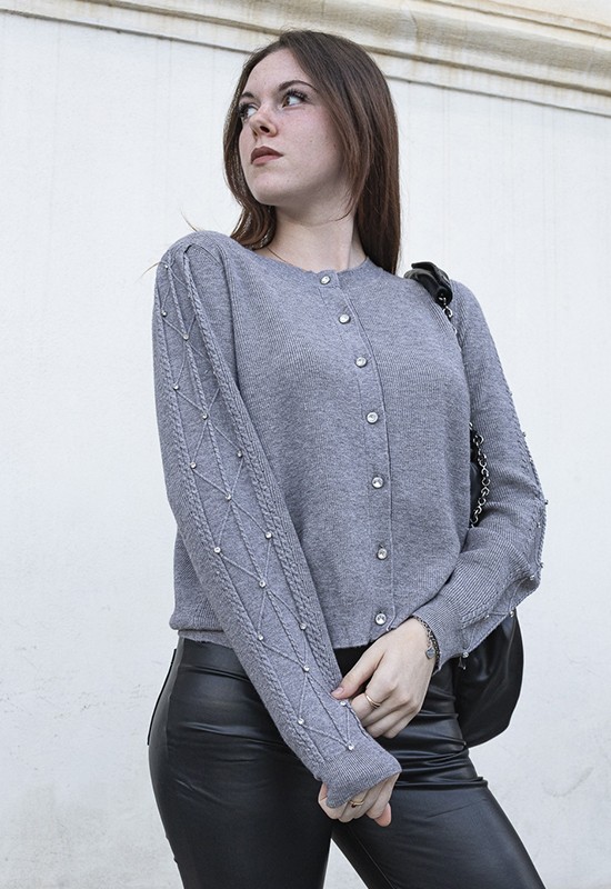 Caedigan girocollo con maniche lunghe a trecce impreziosite con borchie e strass. Misto viscosa Regular fit. Composizione : 52% viscosa 28% poliestere 20% poliammidica