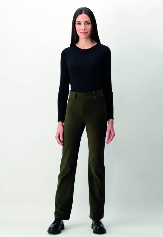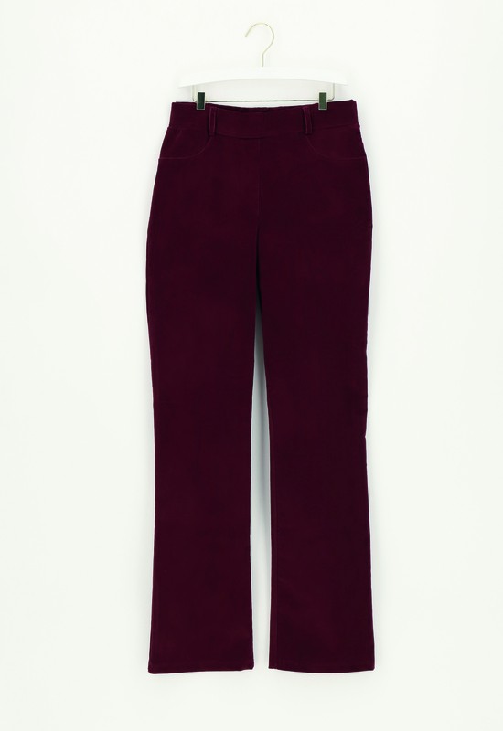 Pantaloni in velluto microcostine elasticizzato a coste ha tasche finte sul davanti e tasche vere sul dietro. E svasato sul fondo. Un leggings comodo si infila velocemente senza cerniere o bottoni. Composizione: 98%cotone 2%elastan