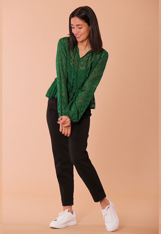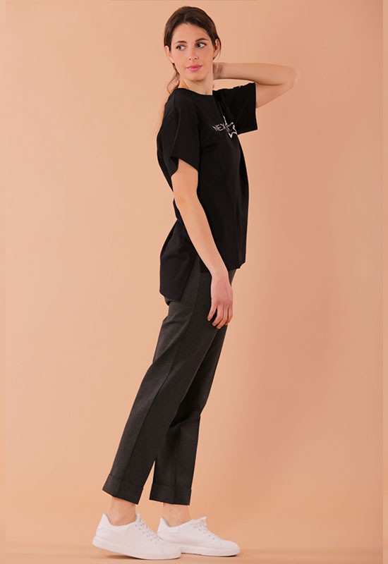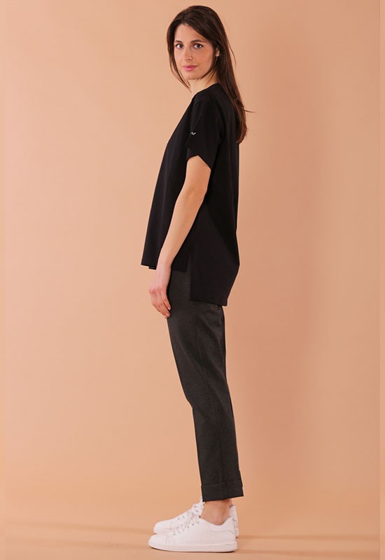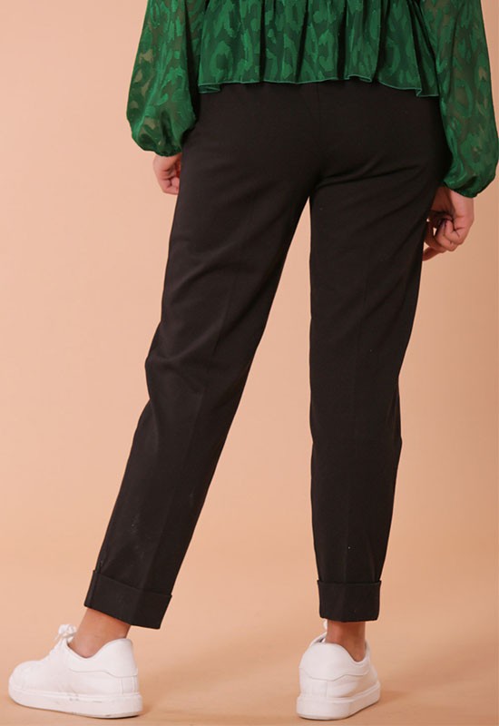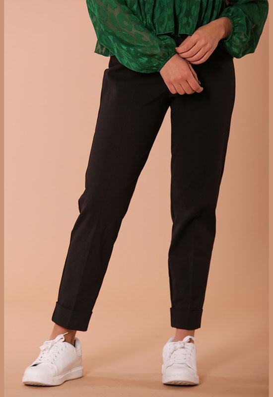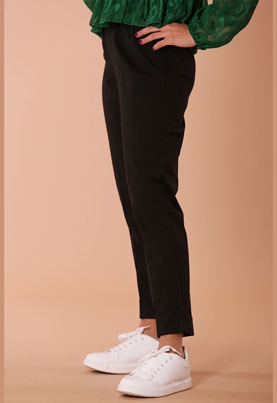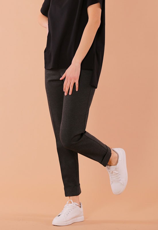 Pantalone jogger con risvolto in punto milano comdodissimo infilato in vita. Composizione : 65% VI 32% NY 3%EA