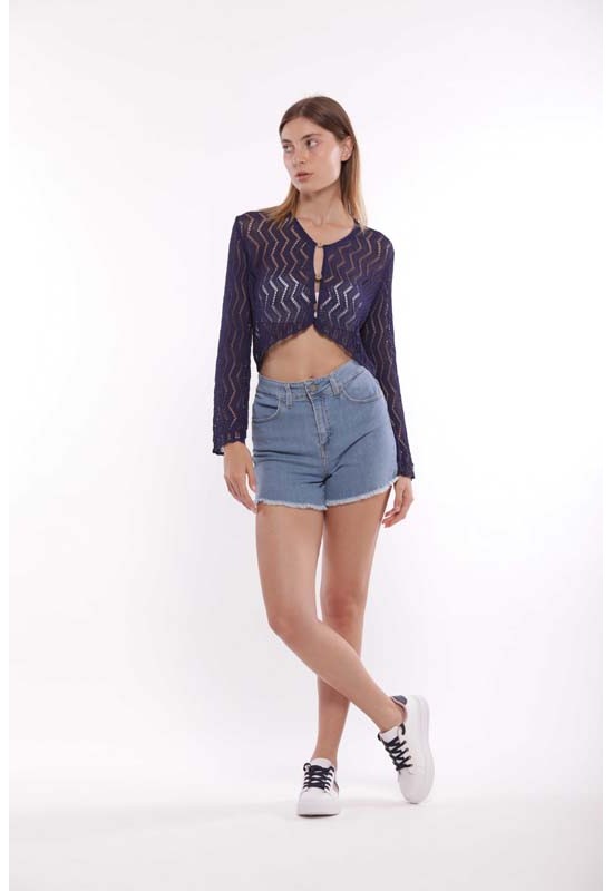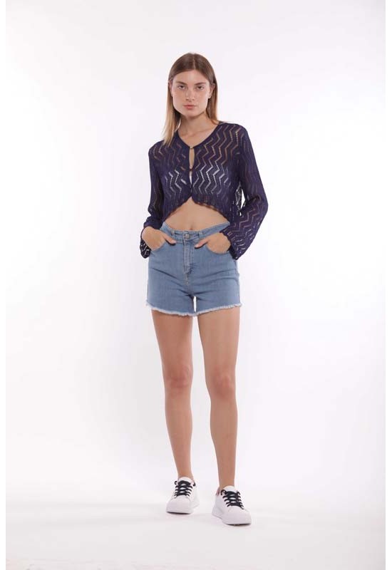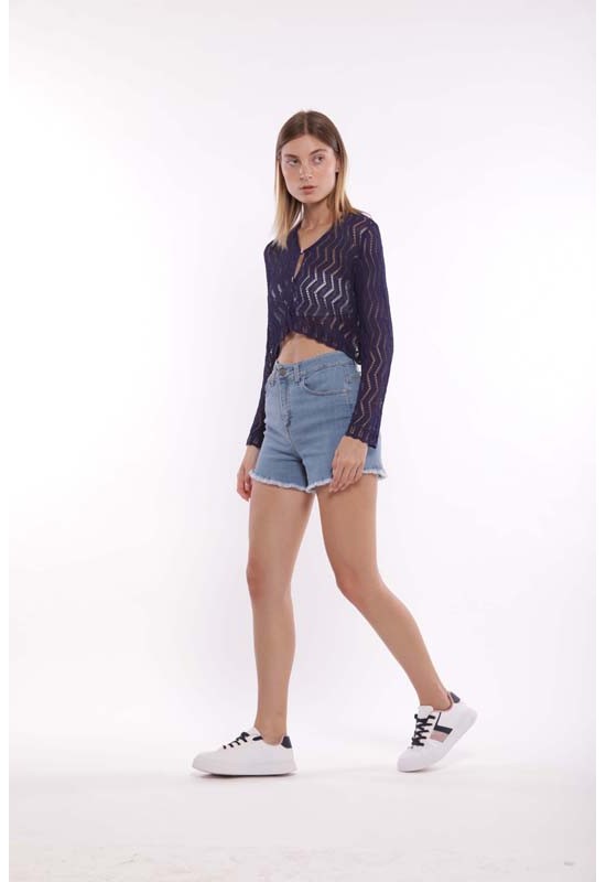 Pantaloncini in jeans corti con bottone e cerniera spenerati. Passanti e tasche davanti e dietro. COMP:98%CO 2%EA