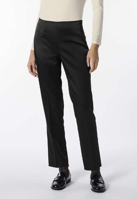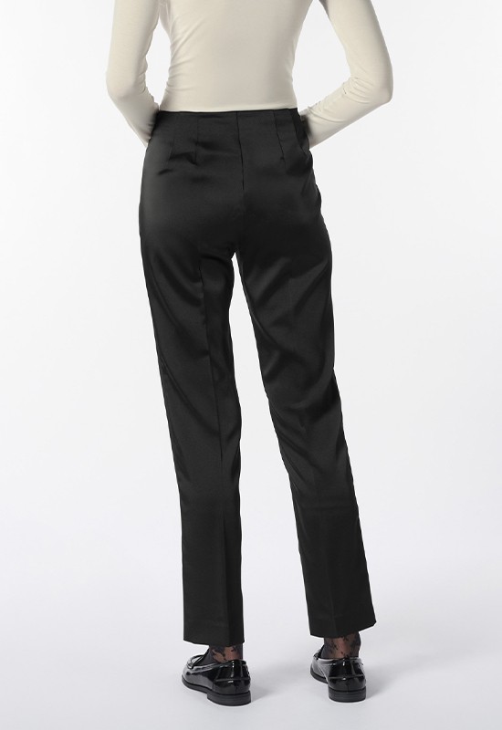 Pantalone effetto raso. Satinato. Altezza vita regolare con cerniera laterale. Gamba dritta a sigaretta. comp: 96% poliestere 4% elastan
