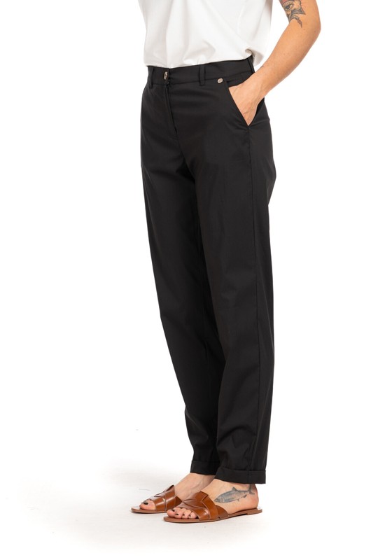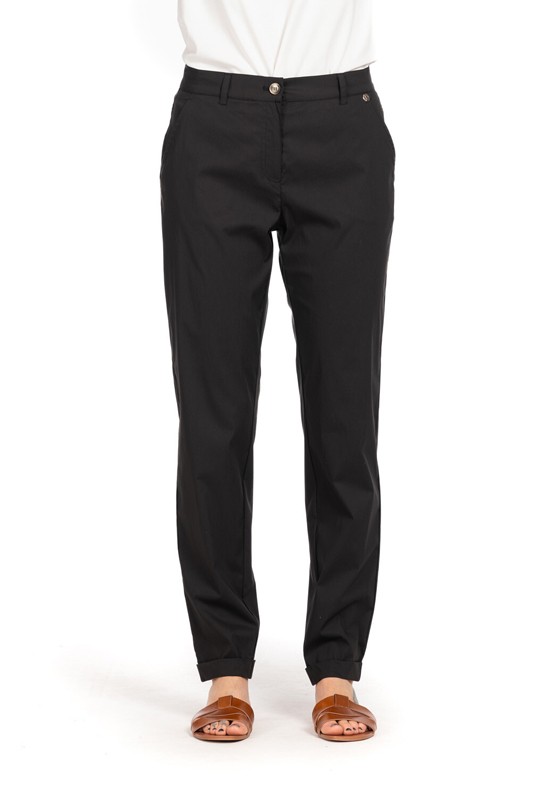 Pantalone slim fit in leggerissimo popeline di cotone con rovescia sul fondo abbottonato davanti con cerniera tasche a filo e passanti per cintura. Composizione: 65%cotone 29% poliammide 6% elastan