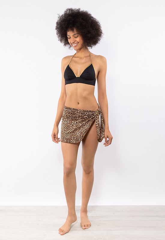 Pareo copricostume animalier realizzato in misto viscosa ed elastan. Bordi rifiniti di color marrone. Composizione 95% viscosa e 5% elastan