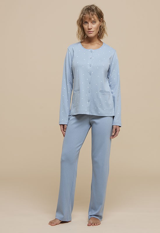 Pigiama donna invernale in caldo cotone aperto davanti pantalone infilato in vita fondo gamba e manica dritto.