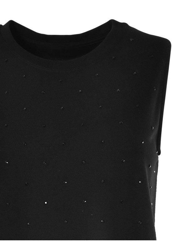 Abito tipo tubino in tessuto elastico e morbido. Spalla larga scollo rotondo. Impreziosito con tanti brillantini. COMP: 65% viscosa 30% poliammide 5% elastan