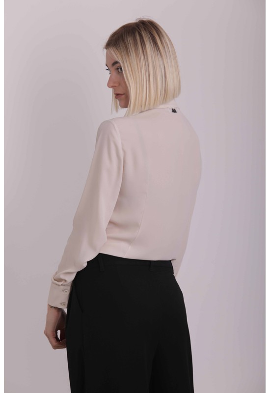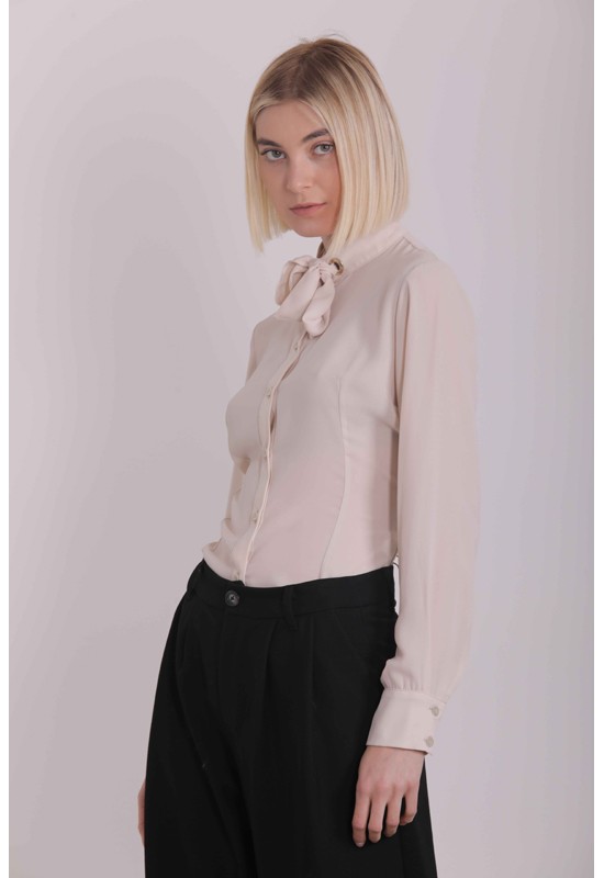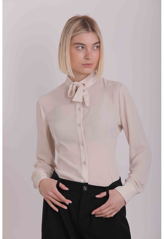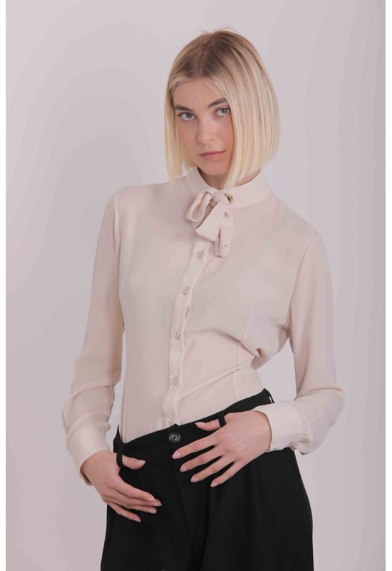 Camicia donna maniche lunghe con collo all'americana arricchita con un fiocco lungo polsino alto alle maniche con due bottoni. Composizione:100% polyestere