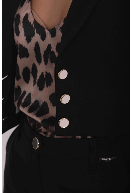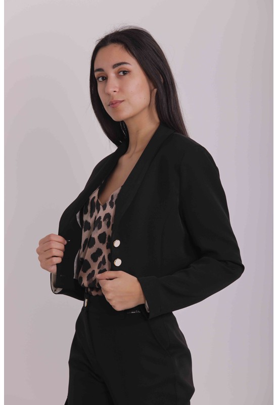 Bolerino sciallato maniche lunghe con fodera maculata all'interno tre bottoni con profilo ora arricchiscono la giacchina corta. Composizione:88% poliestere e 12% elastomero