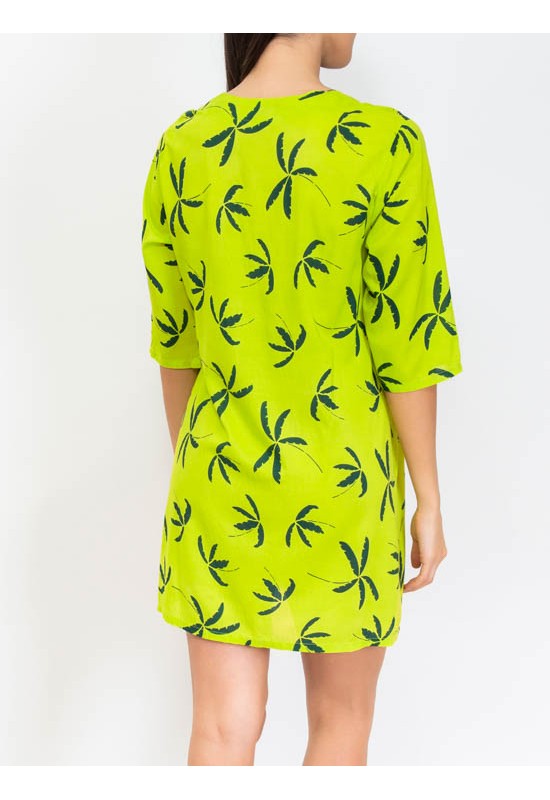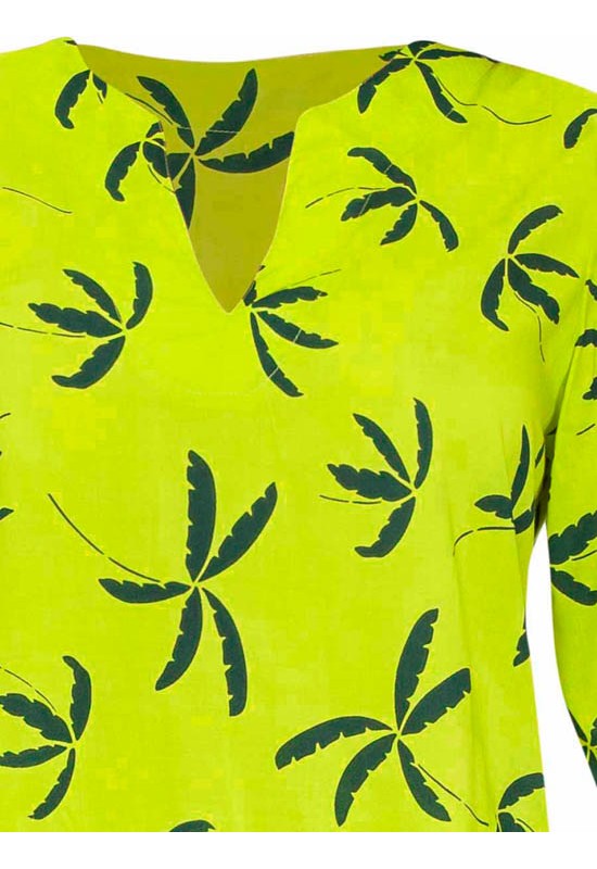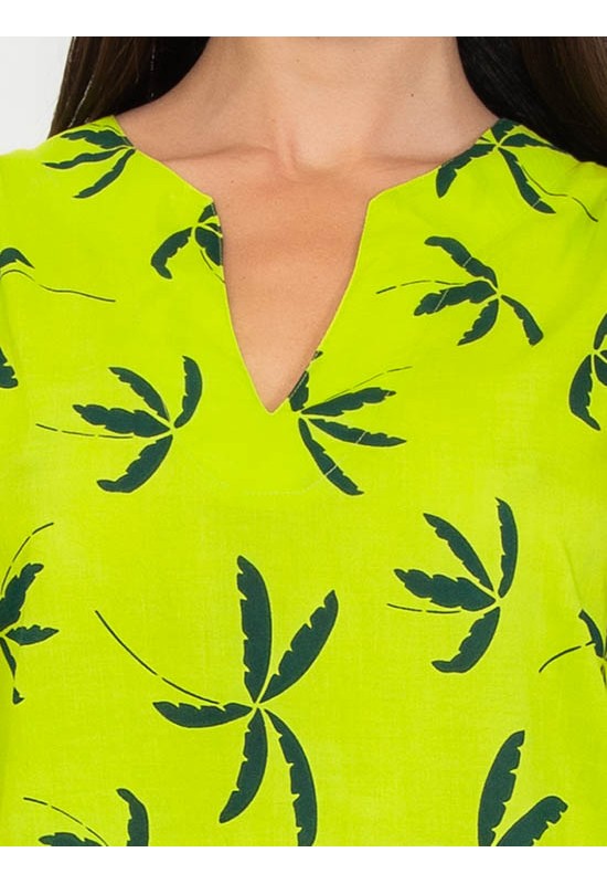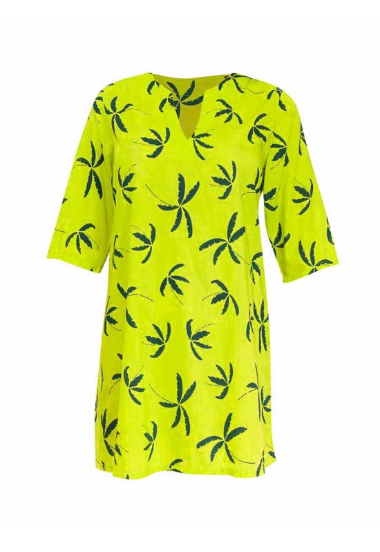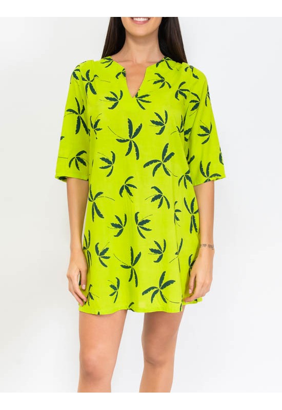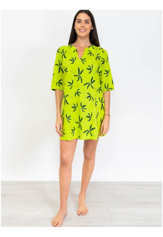 Kaftano con stampa palme fresco e leggero. Manica corta Scollo a V. Comp: 100% viscosa