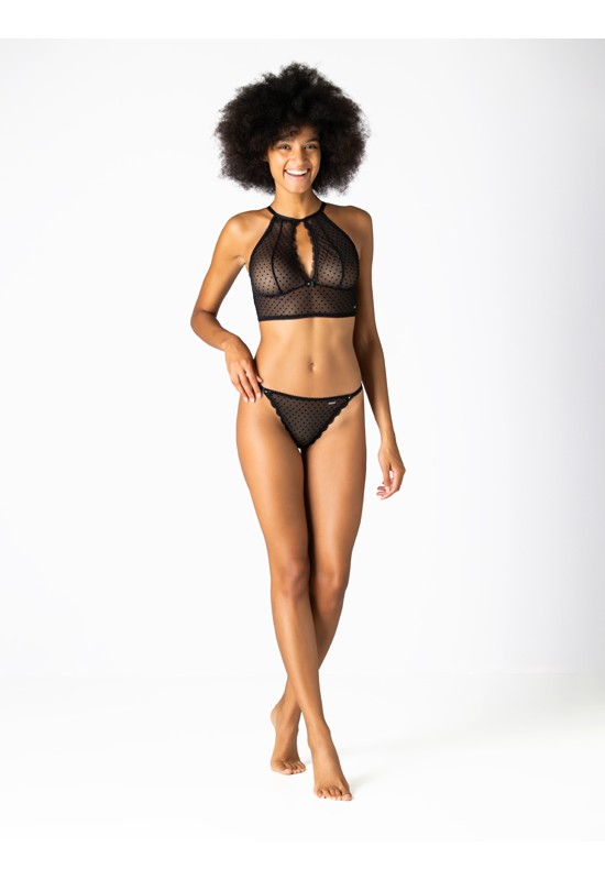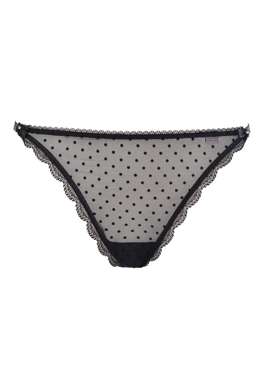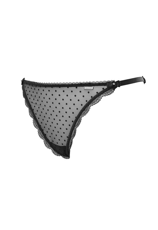 Perizoma in tulle velato con pois tono su tono. Laccetti sui fianchi impreziositi con 2 fiocchetti e brillantini. COMP: 84% POLIAMMIDE 16% ELASTAN