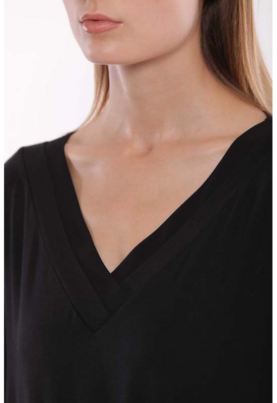T.shirt scollo a v con dettagli in georgette lungo lo scollo e alla manica. Fresca e morbida. Comp: 95% viscosa 5% elasthan