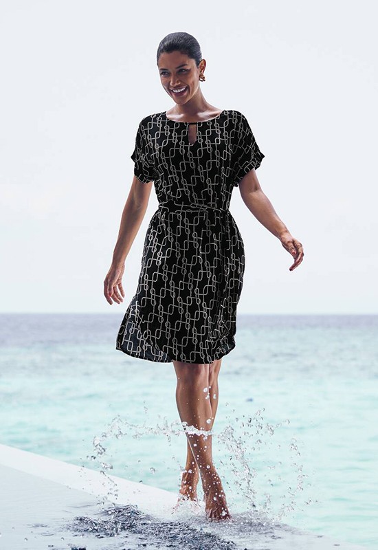 Labito in morbido materiale con uno scollo rotondo moderatamente ampio tasche laterali e una cintura rimovibile in vita perfetto per le giornate calde. comp: 100% viscosa