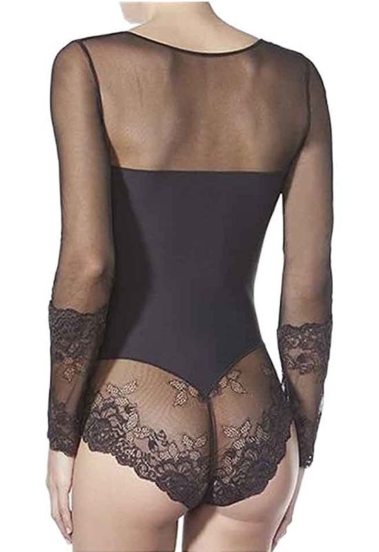 Bellissimo body sottogiacca con manica lunga in tulle e pizzo elasticizzati.