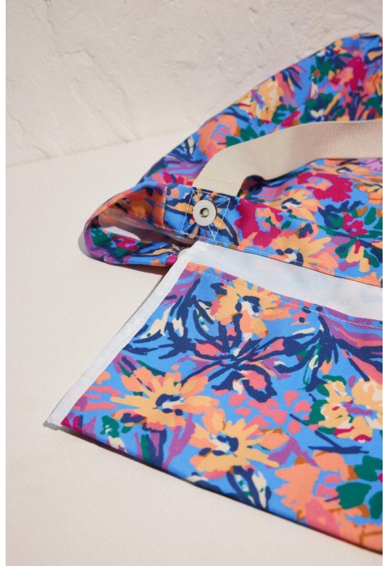 Borsa con stampa fiori multicolori si chiude con bottoni a calamita che permettono di aprire e chiudere facilmente la borsa. Tasca interna per piccoli oggetti. Pratica e funzionale per l'estate! 100% poliestere