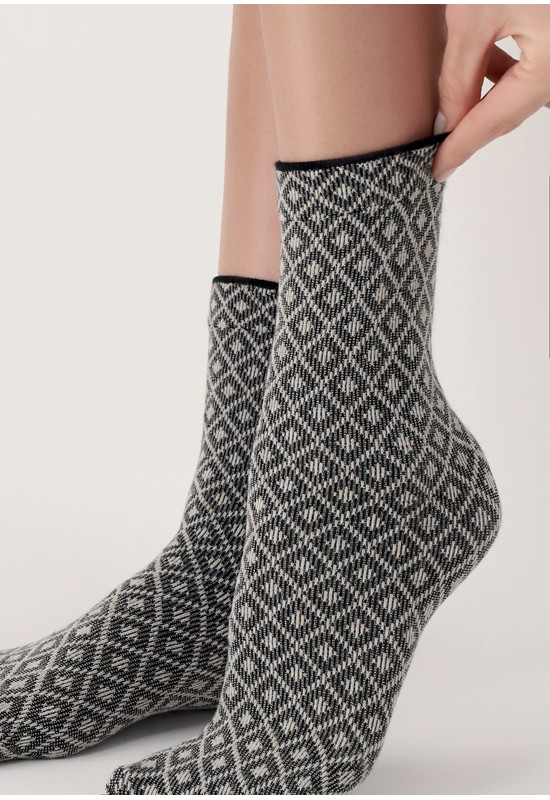 Confezione 2 paia di calzini in due fantasie una fiorita e una geometrica tessuto elastico e morbido Bordo confortevole profilato di nero Composizione: 88% Viscosa 2% Elastam 10% poliammide