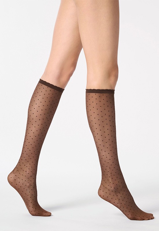 Gambaletto velato effetto tulle con motivo a micro pois. Altezza sotto ginocchio. Comodo bordino. Pesantezza 30 den. Taglia unica comp: 95% poliammide 5% elastan