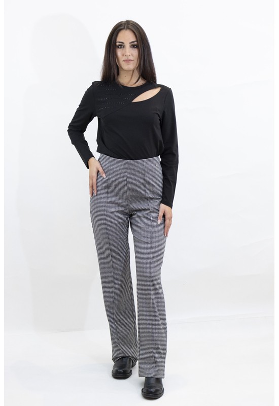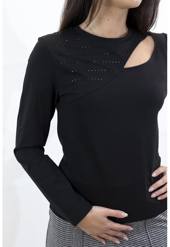Maglia paricollo con scollo particolare. Manica lunga e brillantini tono su tono. Comp: 95% cotone 5% elastan