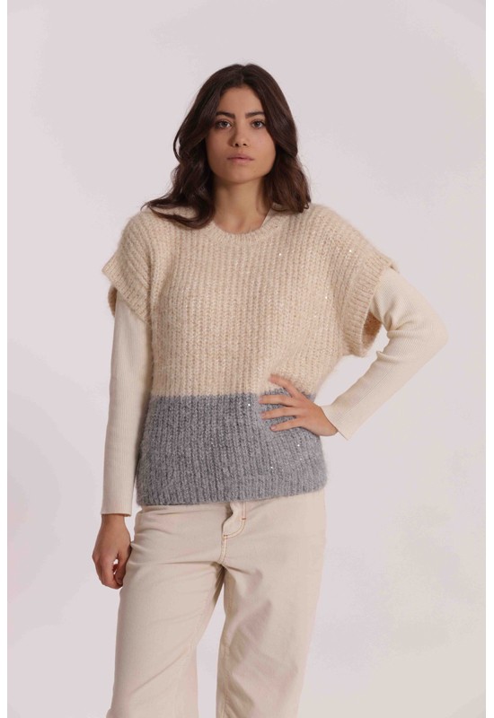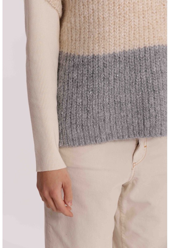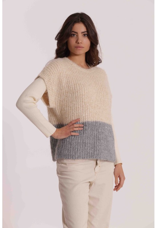 Maglia morbida e calda con maniche corte e taglio over. Bicolore e con dettagli lurex leggero. COMP: 70%PL 22%NY 8%WO