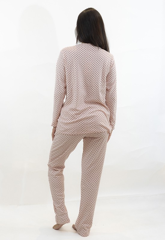 Pigiama in caldo cotone con collo serafino con 5 bottoni. Fantasia piccolina sia nella maglia che nel pantalone. Nessun polsino. Pantalone inflato con elastico e pratiche tasche. comp: 100% cotone