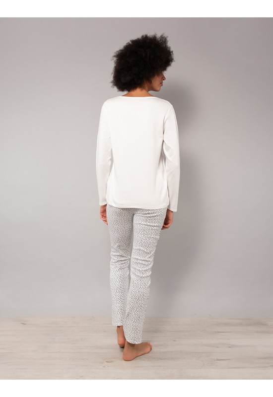 Pigiama in caldo cotone con scollatura a barchetta. Maglia chiara con disegno e pantalone con pois. Nessun polsino. Pntalone infilato in vita con elastico e 2 tasche. comp: 100% cotone