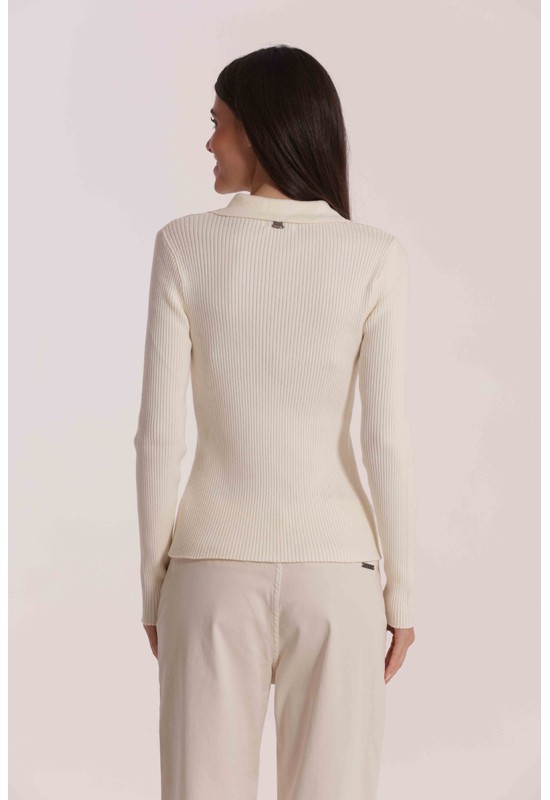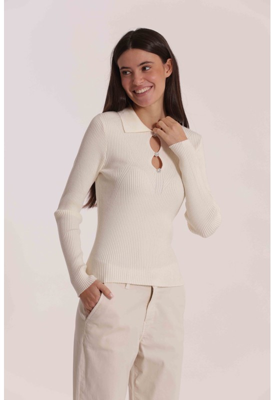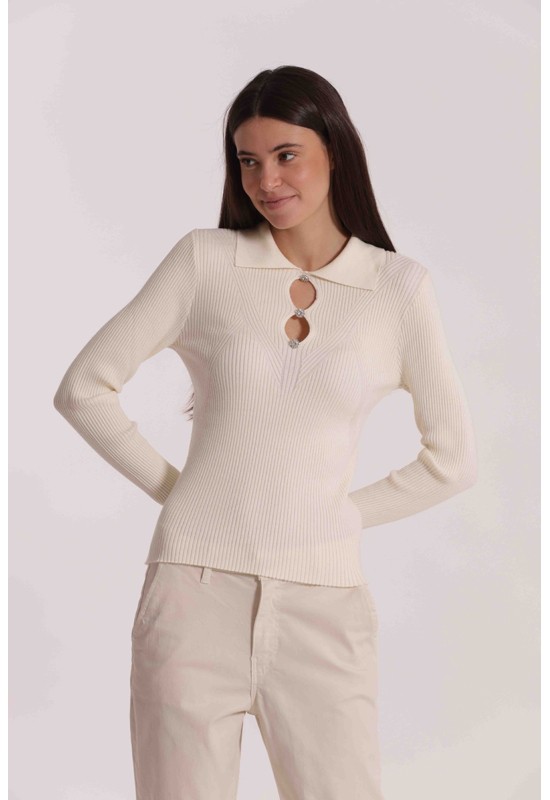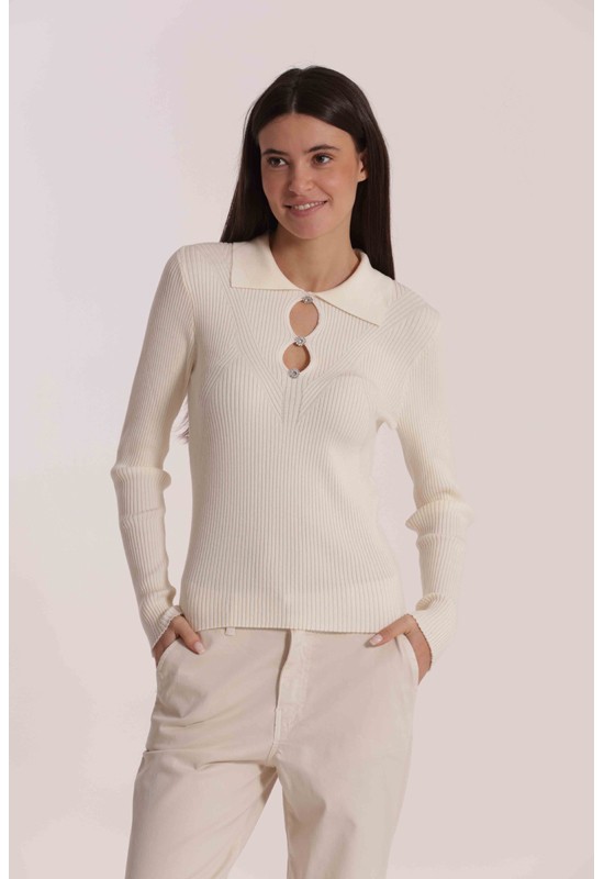 Maglia donna a costine con colletto e deliziosa abbottonatura con bottoni strass. Composizione: 50%VI 28% Pl 22%NY