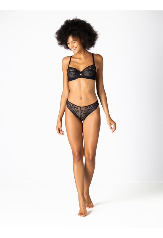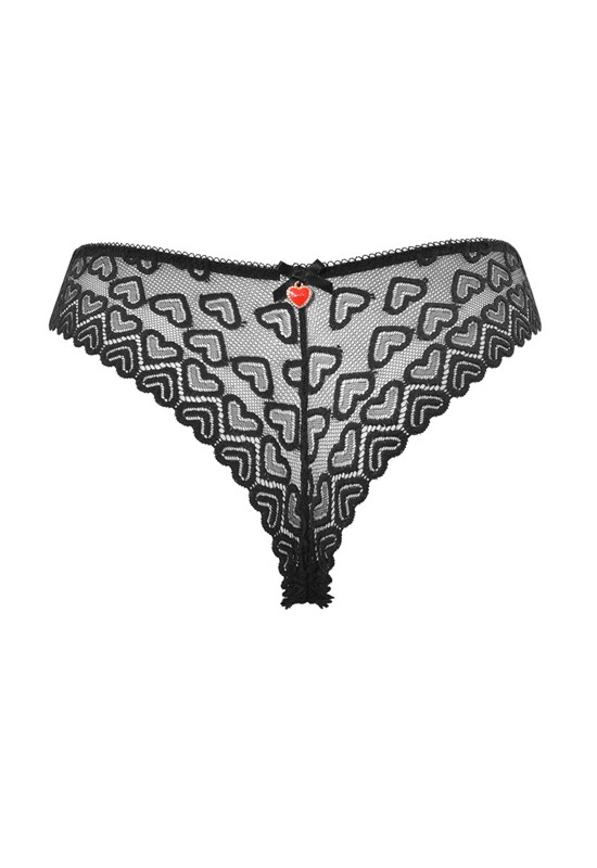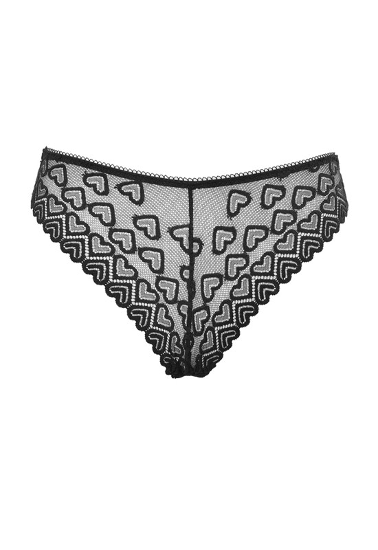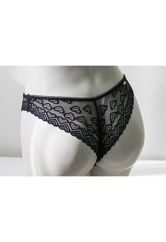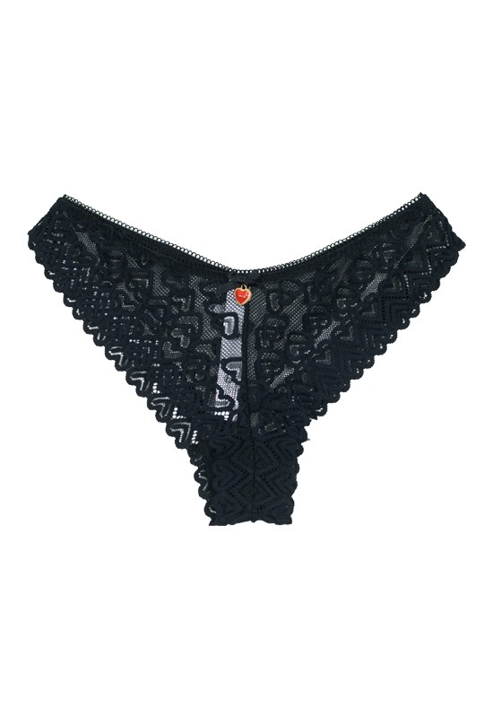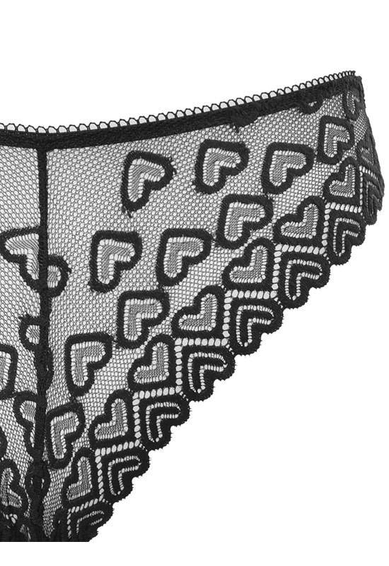 Slip a brasiliana in pizzo a cuori. Vita medio bassa e ciondolino a cuore applicato. Comp: 91% poliammide 9% elastan