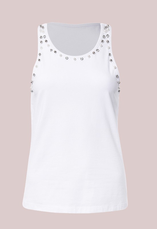 Canotta scollo tondo all'americana. Impreziosita con brillanti e perle al collo e lungo la spalla. Fresca e leggera. Comp: 94% cotone 6% elastan